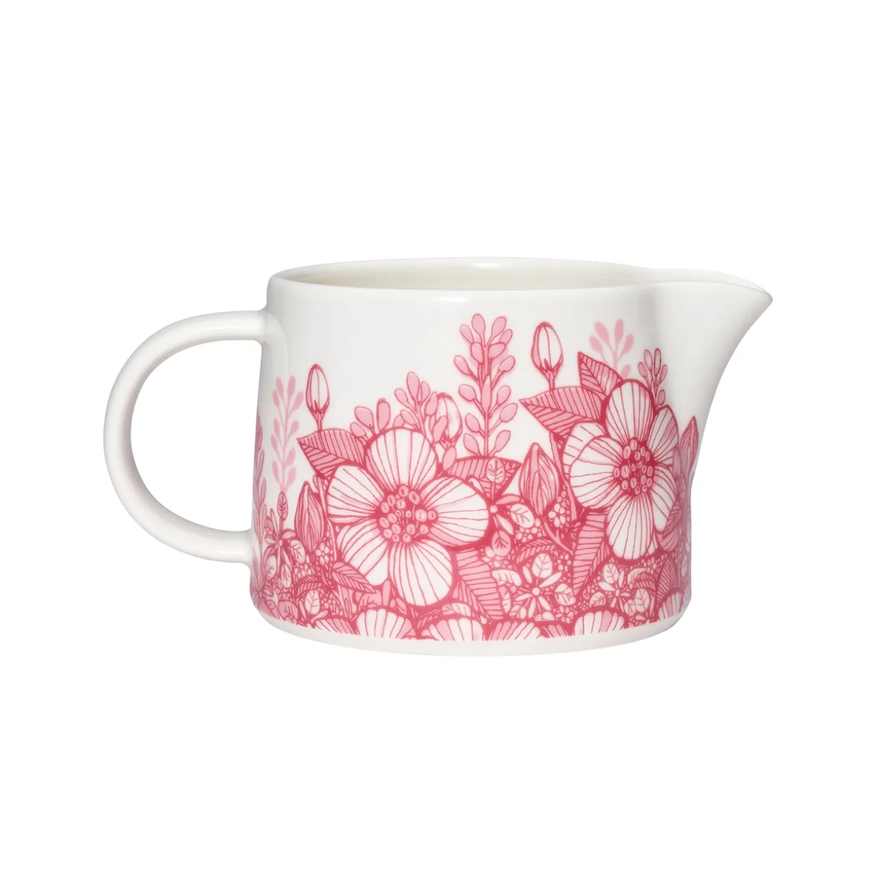 Matala Huvila 0,35 L kaadin on kaunis lisä kahvipöytään. Se on ihanteellisen kokoinen pieneksi maitokannuksi tai erilaisille kastikkeille illallisen tai jälkiruoan kanssa. Heini Riitahuhdan herkkä käsin piirretty vaaleanpunainen ruusukuvio sopii luontevasti myös valkoisten astioiden kanssa, jolloin siitä tulee kattauksen kukkiva keskipiste.