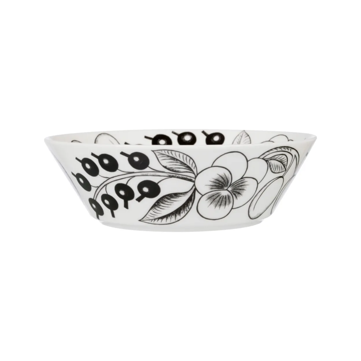 Runsaasti koristeltu mustavalkoinen Paratiisi 17cm kulho on täydellinen valinta aamiaiselle sekä keittojen tarjoiluun. Kulhon korkeat, loivasti avautuvat reunat tekevät siitä erityisen käytännöllisen. Birger Kaipiaisen valtoimenaan kukkiva mustavalkoinen köynnöskoriste on rauhallinen mutta näyttävä. Yhdistä Arabian muihin sarjoihin.