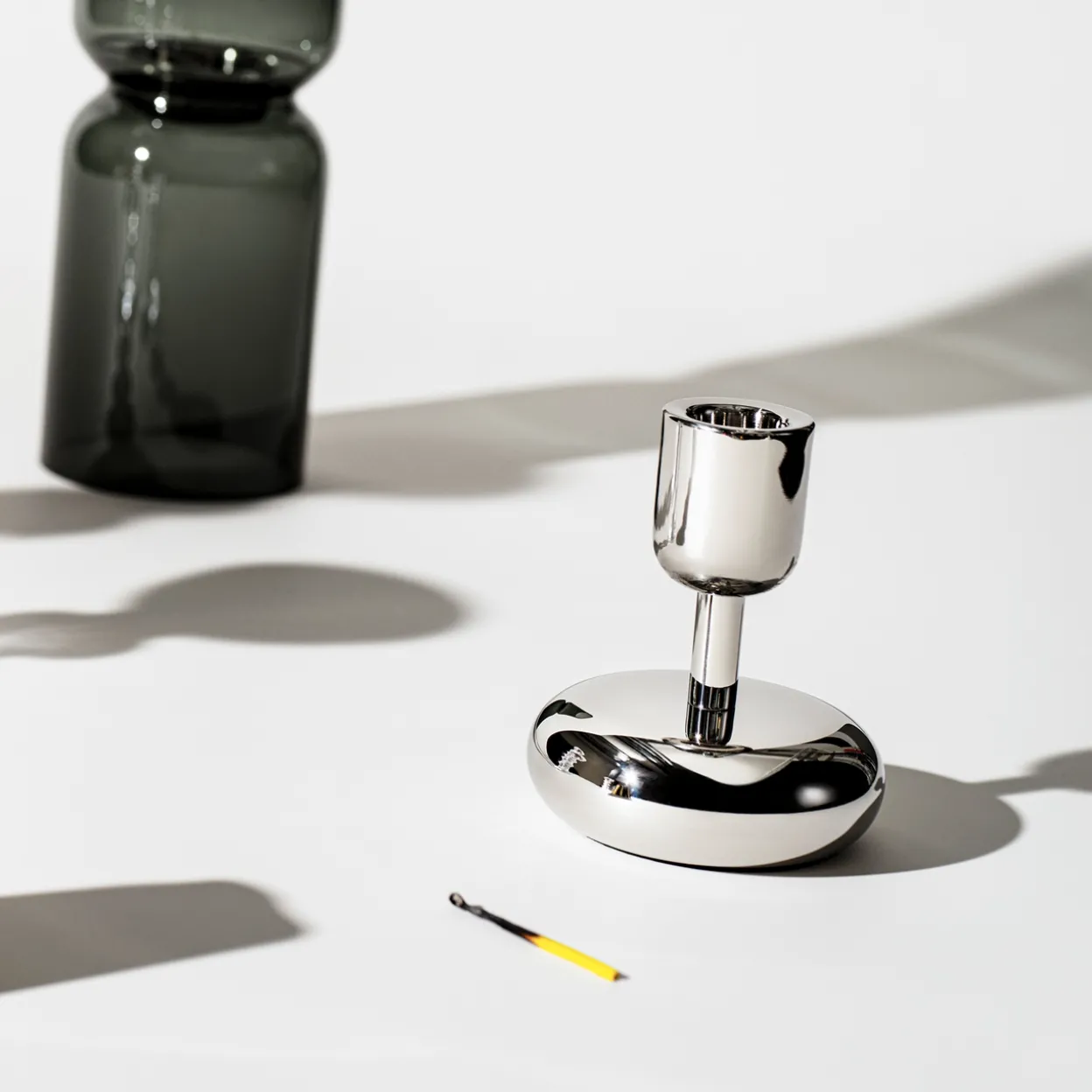 Muotoilija Matti Klenell sai idean Nappula-kynttiläjalkoihin pyöreistä pöydänjaloista. Klenellin rakkaus moderniin muotoiluun ja vintageen yhdistyy hienosti kynttilänjalan tyylikkään kapean jalan ja pyöreämuotoisen pohjan kontrastissa. Nappulan kaunis ja käytännöllinen muoto edustaa Klenellin töille ominaista pohjoismaista muotoilufilosofiaa, jossa muoto ja funktionaalisuus yhdistyvät. Ruostumattomasta teräksestä valmistettu pienin Nappula-kynttilänjalka on sisustuksen katseenvangitsija. Klassisen minimalistisessa muodossa modernit piirteet yhdistyvät vintage-elementteihin. Nappula on modernin muotoilun klassikko: kynttilän pehmeä valo luo lämpimän tunnelman kaikkiin sisustuksiin. Sammaleenvihreä sävy luo sisustukseen luonnon sävyjä. Näyttävä yksinään tai ryhmäksi koottuna. Hieno lahjaidea. Ainoastaan antiikki- ja pallokynttilöille.