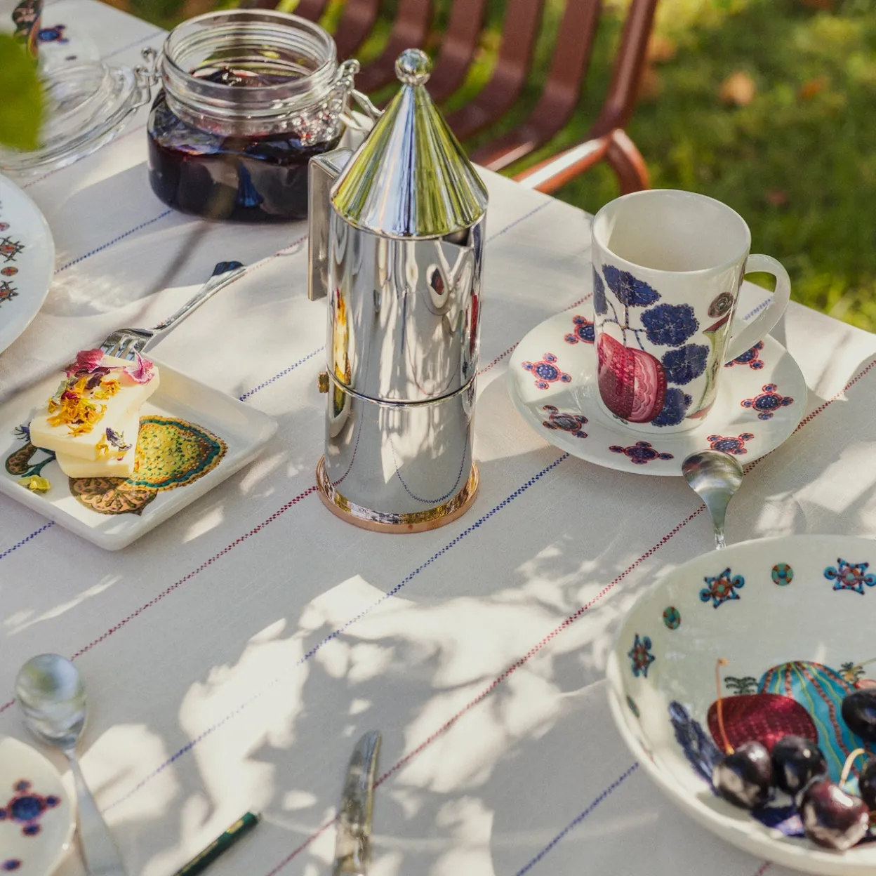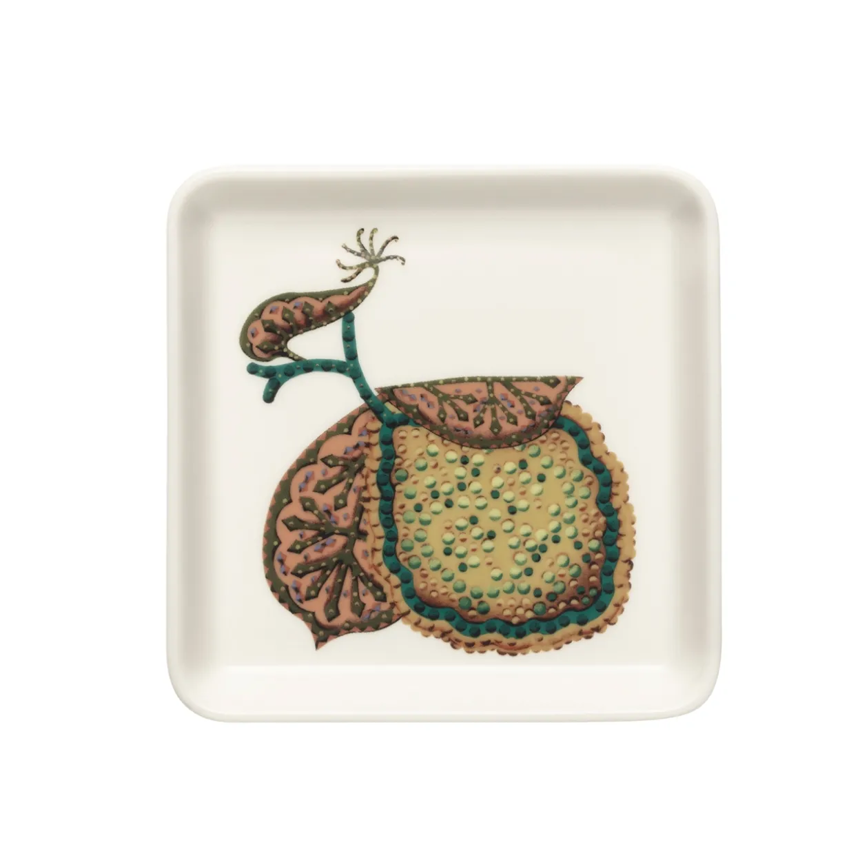 Kun yhdistää Klaus Haapaniemen eloisan taiteen ja Heikki Orvolan ajattoman muotokielen syntyy jotakin todella kiinnostavaa. Taika Sato -sarjan 12x12cm neliölautanen on sekä käytännöllinen että koristeellinen, sopien kooltaan pienille alkupaloille ja herkuille sekä tarjoiluun. Lautasen käyttökohteet ovat kuitenkin loppumattomat myös ruokailun ulkopuolella. Laita esille kauneimmat korusi tai nosta lautaselle kylpyhuoneessa suosikki hajuvetesi. Klaus Haapaniemi on kuvittanut lautaselle kiehtovan asetelman hedelmiä, joiden tuoksun voit melkein tuntea. Monikäyttöinen lautanen on täydellinen lahjaidea kaikille, jotka rakastavat leikkisyyttä ja tarinankerrontaa.