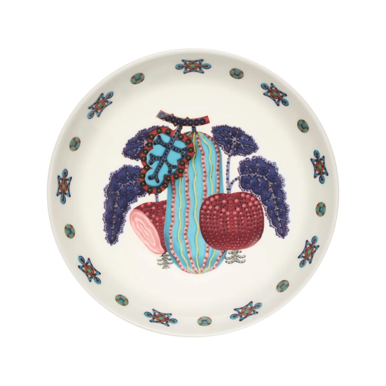 Monipuolinen 20cm syvä lautanen on täydellinen valinta niin pastalle, salaateille kuin nuudeleille. Voit luoda kattauksen täynnä kuvioita ja värejä yhdistelemällä Klaus Haapaniemen Taika-kuvioita tai lisätä muutaman valitun Taika Sato -tuotteen osaksi kokonaisuutta. Taika Sato on yhdistelmä Klaus Haapaniemen eloisia kuvituksia sekä Heikki Orvolan ajattomia ja pelkistettyjä muotoja. Asetelmataiteen innoittama kuvio luo pysähtyneen tunnelman taianomaisine hedelmineen ja vihanneksineen. Kauniit kuvitukset hehkuvat kirkkaissa väreissä valkoisella pohjalla. Lautanen on mikrouuni ja konepesun kestävä. Hyvä lahjaidea.