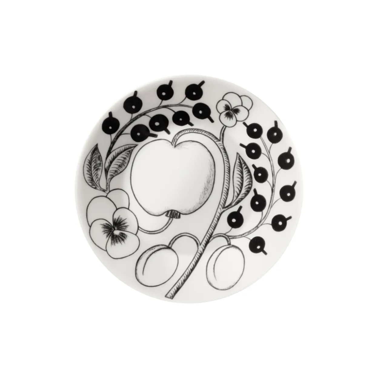 Rakastettu Paratiisi on suomalaisten kattausten klassikko. Birger Kaipiainen suunnitteli sarjasta alun perin sekä sini-keltaisen että mustavalkoisen version. Mustavalkoisena runsas kukka- ja hedelmäaiheinen kuvio korostuu hienostuneesti. Sarjan 14cm vati sopii 0,18L kupin alusvadiksi ja myös pienten herkkujen tarjoiluun.