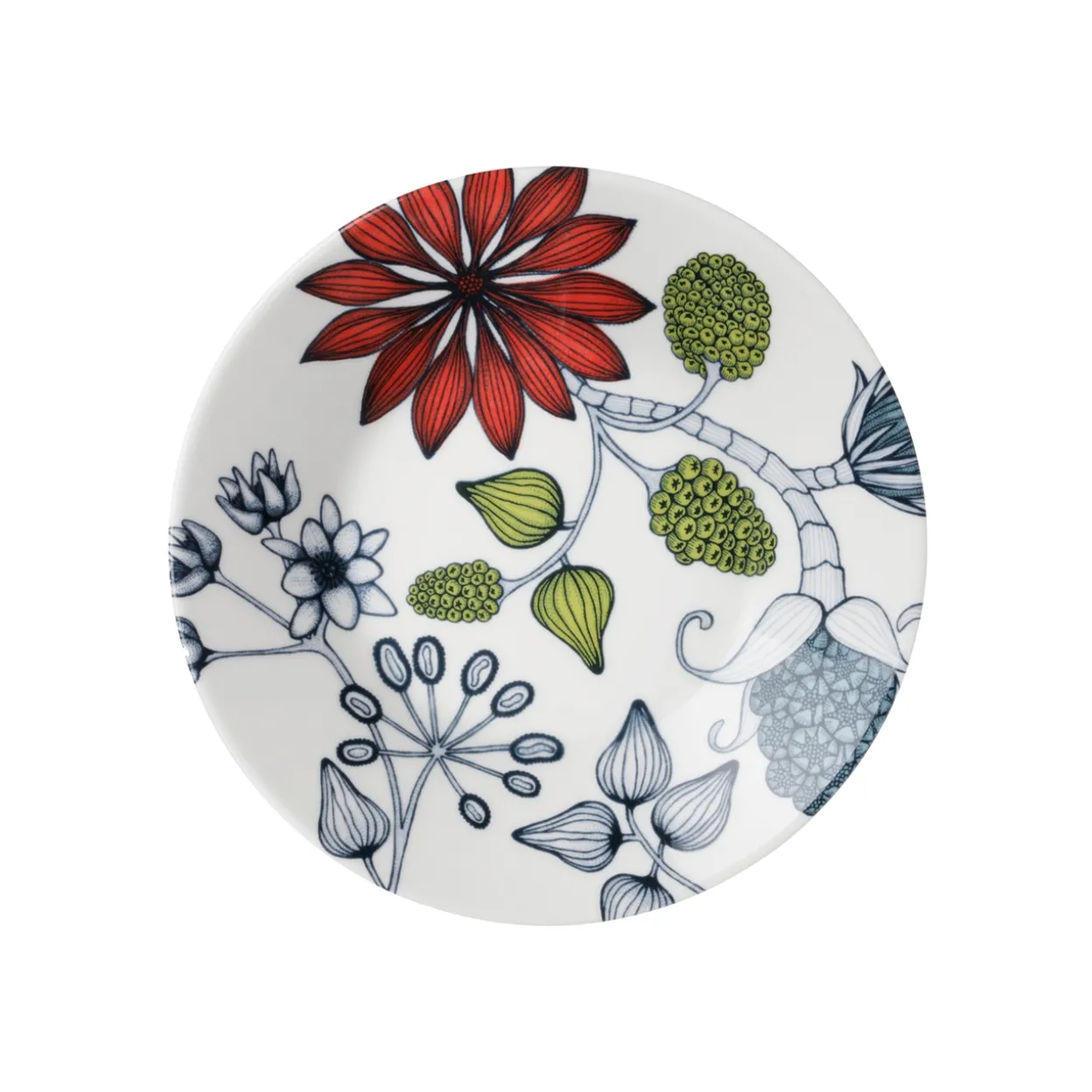 Kohota kattaustasi Runo Kesäsäde -lautasella (16,5 cm), jonka on suunnitellut Heini Riitahuhta. Herkkä käsin piirretty kuvio esittelee kauniita kukkia, lehtiä ja nuppuja, joita korostaa näyttävä musteensininen väri. Lautanen on valmistettu kestävästä vitroposliinista ja sopii täydellisesti 0,28 l mukin pariksi. Ihanteellinen arkeen ja lahjaksi.