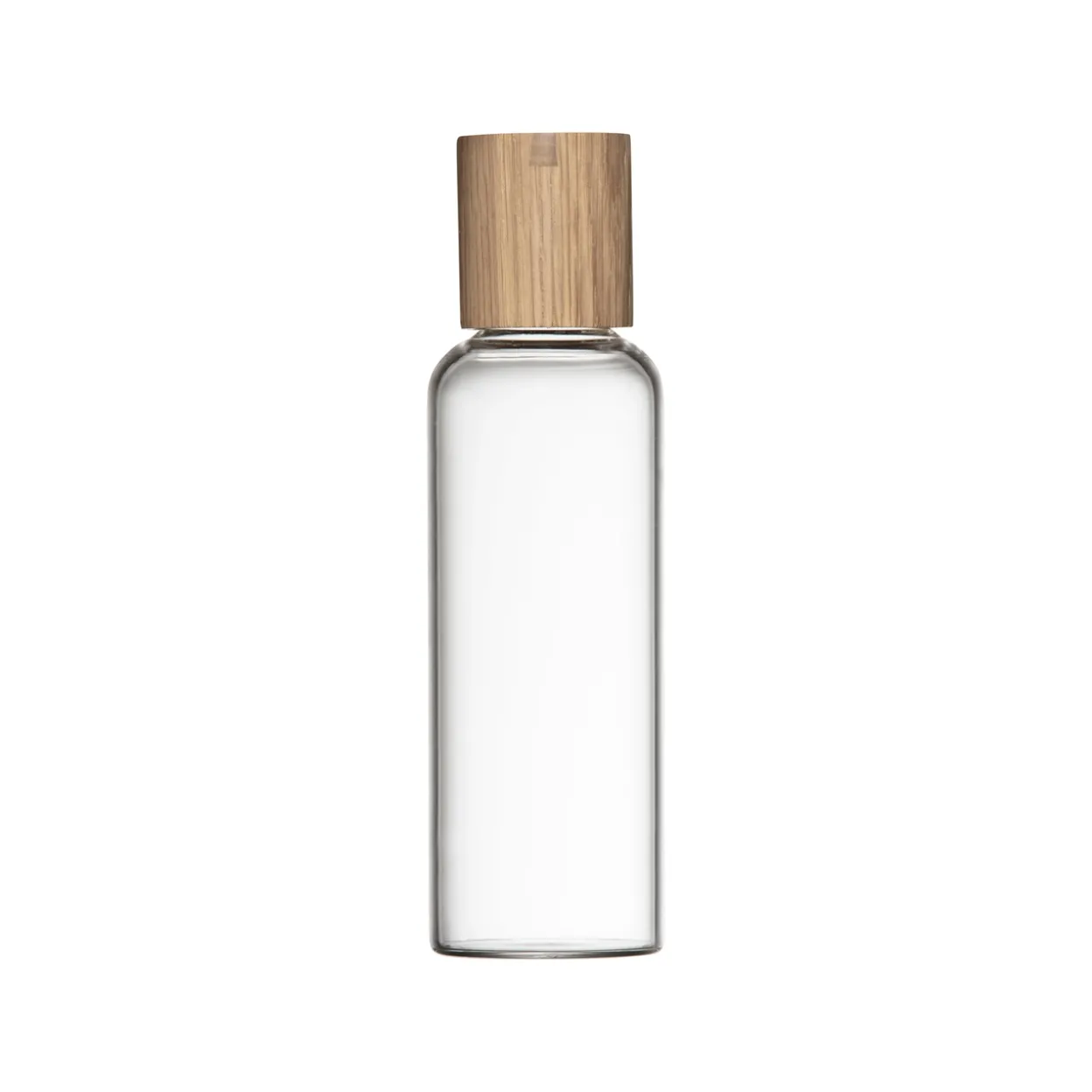 Kestävästä borosilikaattilasista valmistettu pullo on helppo täyttää ja kantaa. Tammesta valmistetussa isossa korkissa on yksityiskohtana erityinen pyrstöliitos. Pidä vesipullo työpisteellä tai anna lahjaksi aktiivista elämää viettävälle ystävälle. Vain käsinpesu.